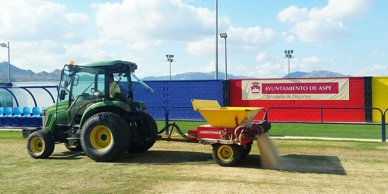 La Concejalía de Deportes del Ayuntamiento de Aspe ha comenzado esta semana los trabajos de resiembra del césped del Campo de Fútbol Municipal Las Fuentes, de cara a afrontar el próximo periodo invernal con las mejores condiciones de juego posibles. Las tareas a realizar darán continuidad a las acometidas en las áreas de las porterías el pasado mes de junio. Ahora se está llevando a cabo el escarificado y aireado de todo el terreno de juego, además de la nivelación con recebo de algunas zonas del campo más desigualadas.