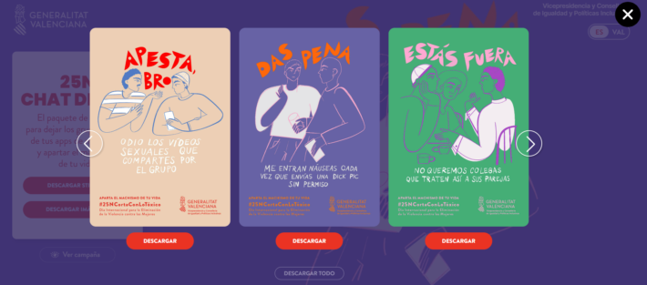 El objeto de la campaña institucional de este año es acercarnos a la gente joven, especialmente a los chicos jóvenes, ofreciéndolos herramientas para que puedan afrontar conductas machistas que se produzcan entre personas de su entorno (colegas, amigos…). El machismo sutil, las conductas o comentarios abusivos hacia las mujeres, el compartir videos de contenido…