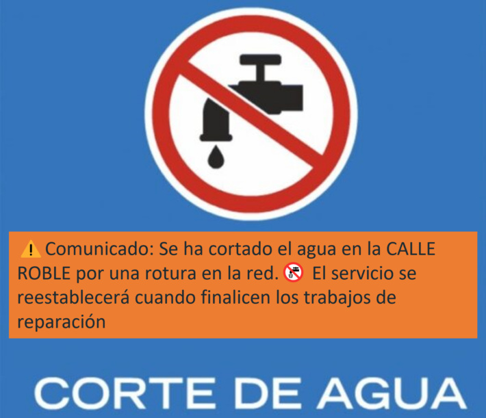 ⚠️Comunicado: Se ha cortado el agua en la CALLE ROBLE por una rotura en la red.🚱 El servicio se reestablecerá cuando finalicen los trabajos de reparación