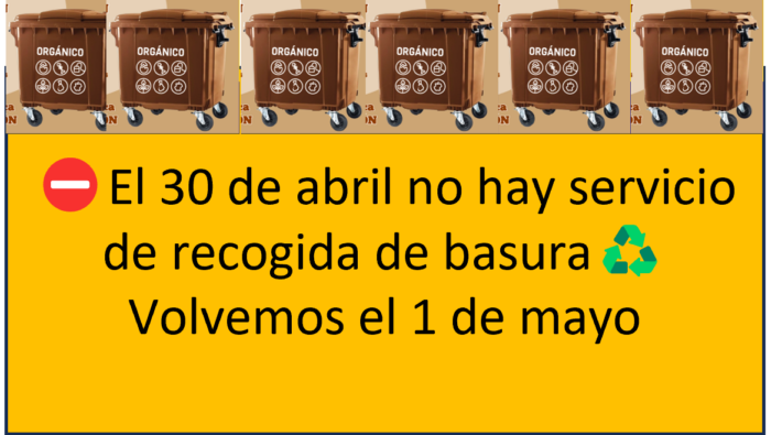 El 30 de abril, víspera de festivo, no habrá servicio de recogida de basuras. Los vecinos y vecinas podrán depositar su basura en contenedores o en su portal tanto el día 29 como el 1 de mayo.