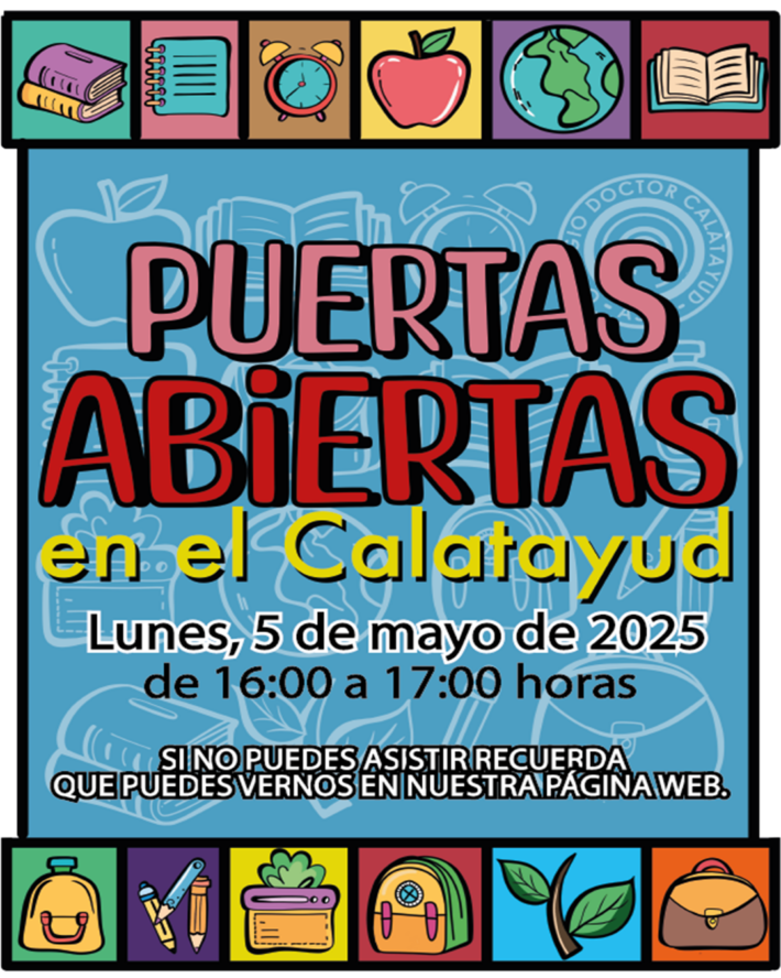 ¡Jornada de Puertas Abiertas en el Colegio Calatayud! El próximo lunes 5 de mayo, de 16:00 a 17:00 horas, el Colegio Calatayud abre sus puertas para que familias y futuros alumnos puedan conocer nuestras instalaciones, proyectos educativos y equipo docente.