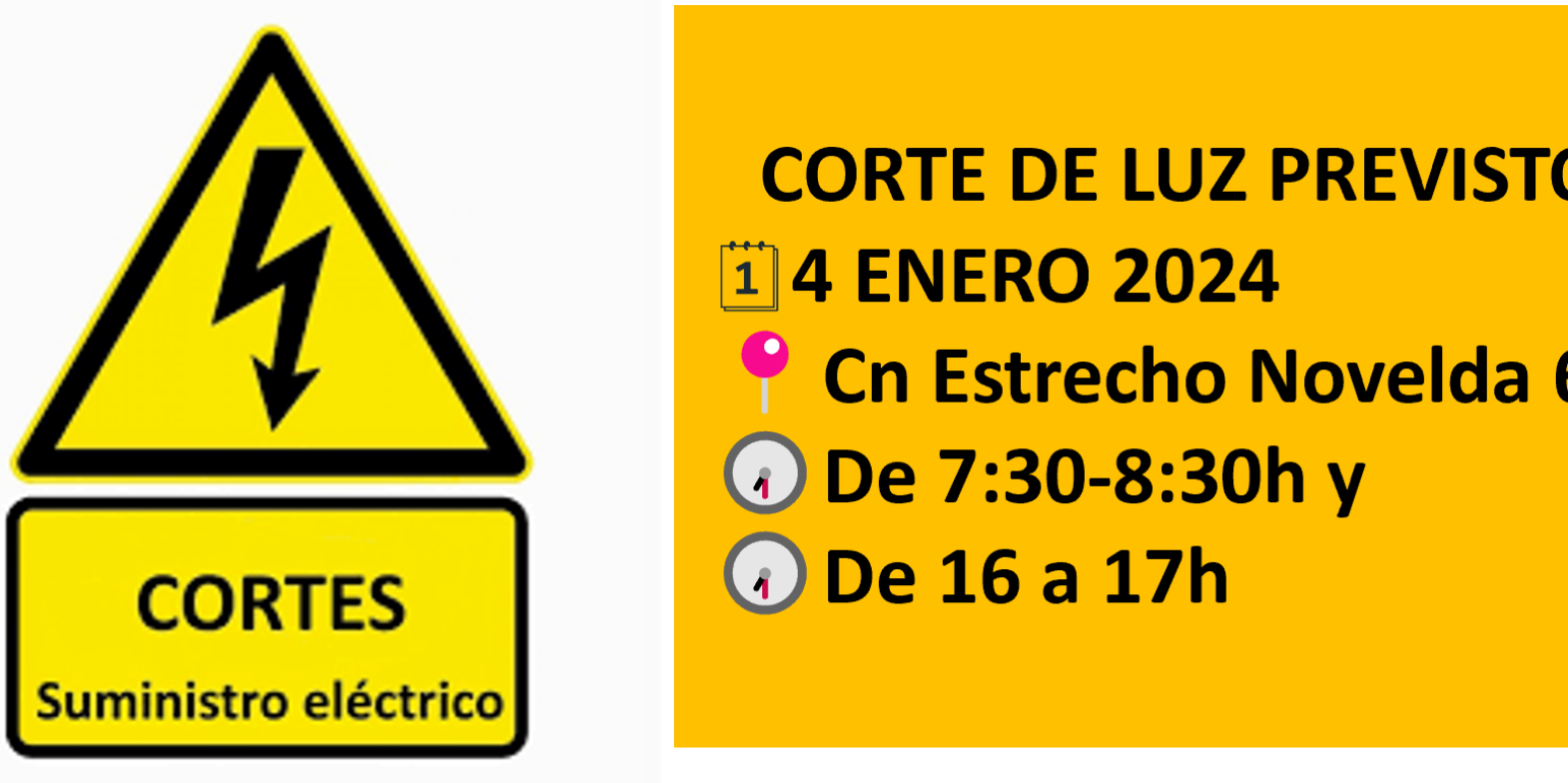 AVISO POR CORTE DE LUZ EN Cn Estrecho Novelda: 69 1er corte, de 7:30 a 8:30h 2do corte, de 16 a 17h Comparte esta información Share on FacebookShare on Facebook Share on XShare on X Share on WhatsAppShare on WhatsApp TweetShare on Pinterest Share on LinkedInShare on LinkedIn