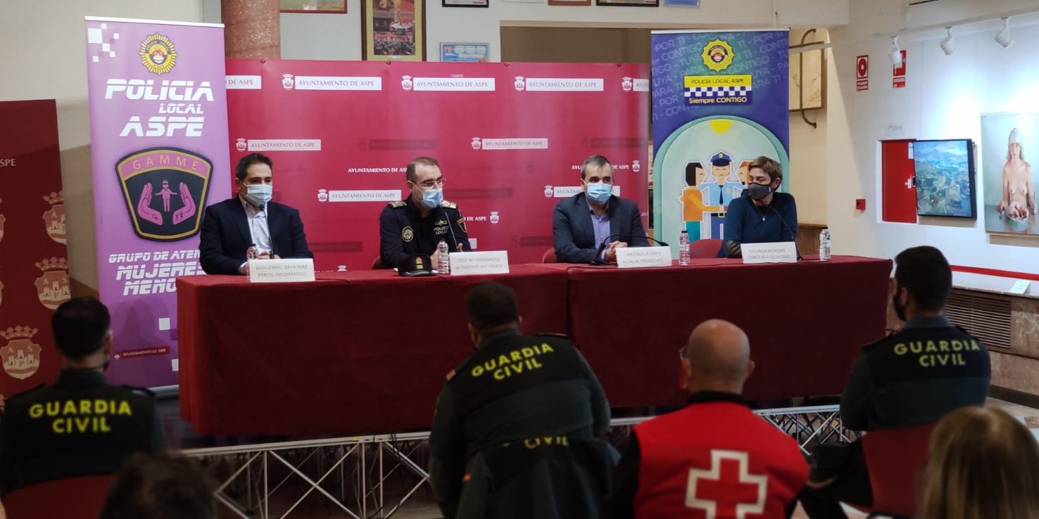 El Alcalde de Aspe, Antonio Puerto, en compañía de la Concejala de Igualdad, Yolanda Moreno y del Intendente Jefe de la Policía, José Manuel Hernández, presentan la nueva unidad de violencia de género de la Policía Local, el Grupo de Atención a Mujeres y Menores –GAMME-, dentro del plan estratégico implementado en el seno del Cuerpo de Policía que está llevando a cabo la Concejalía de Seguridad dirigida por José Vicente Pérez, y todo ello con el fin de dotar personal específico para prestar una mayor atención integral a las víctimas de violencia de género, dado que dicha unidad va a trabajar en red con otros cuerpos de seguridad y con los técnicos y responsables de las Concejalías de Igualdad, Educación y Servicios Sociales.