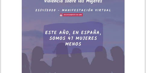 Como todos los años, la Concejalía de Igualdad conmemora el 25 de Noviembre mediante un acto institucional de lectura de manifiesto a las 12h en la Plaza Mayor, y queremos que Aspe se sume mediante manifestación virtual con el lema «Este año, en España, somos 41 mujeres menos».