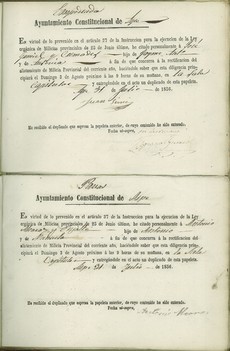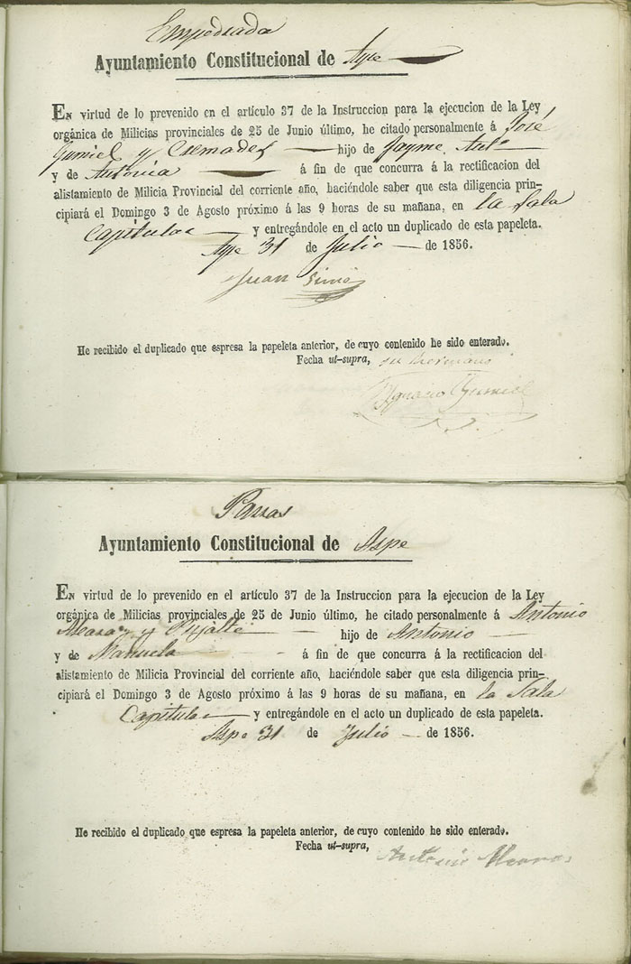 Actas de Alistamiento, 1856.