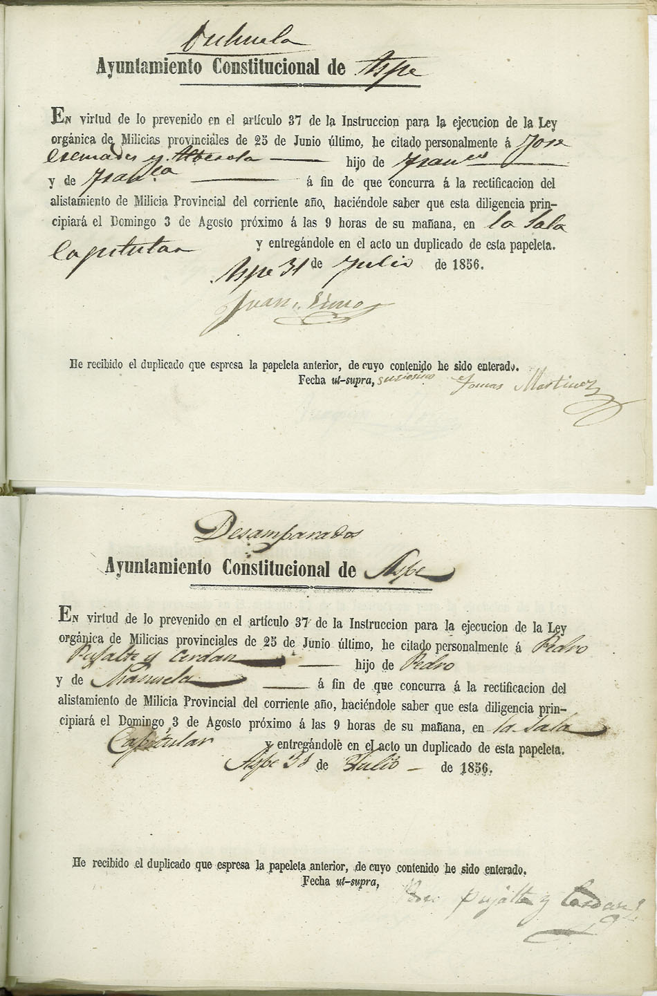 Actas de Alistamiento, 1856.
