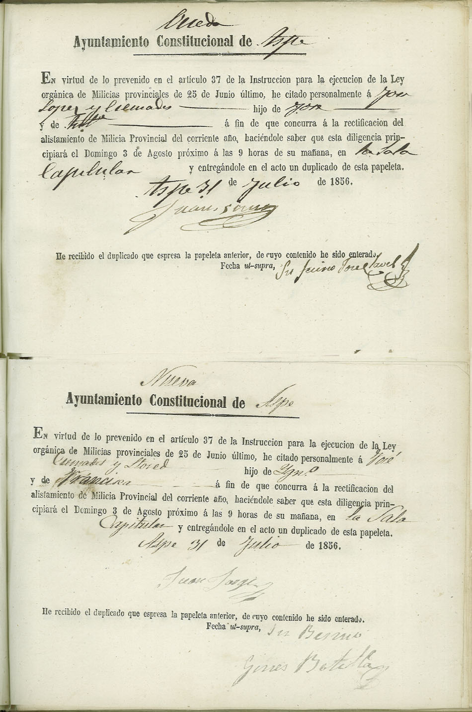 Actas de Alistamiento, 1856.