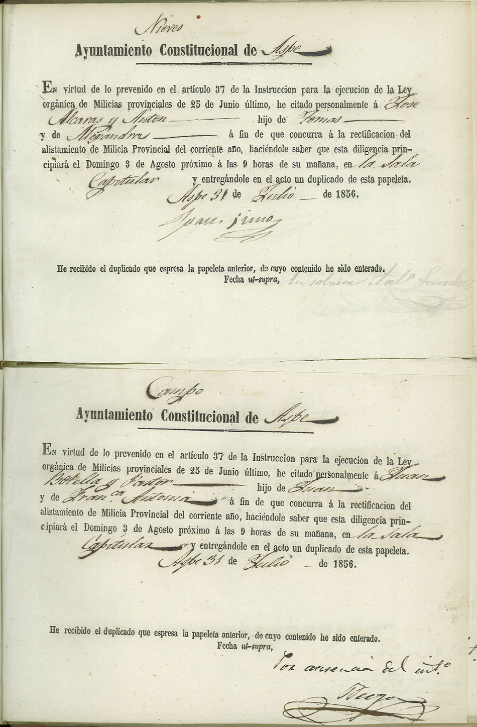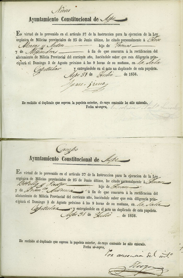 Actas de Alistamiento, 1856.
