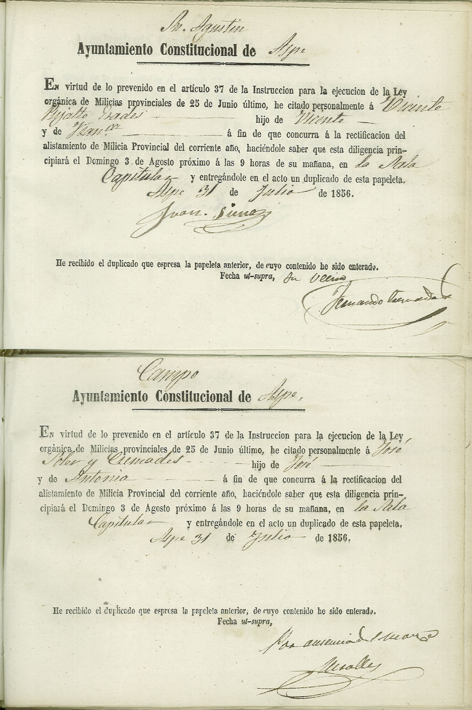Actas de Alistamiento, 1856.