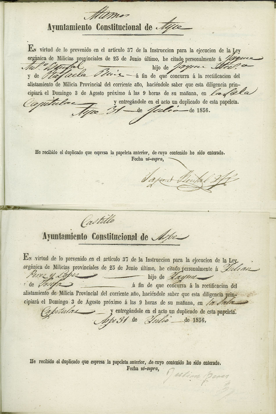 Actas de Alistamiento, 1856.