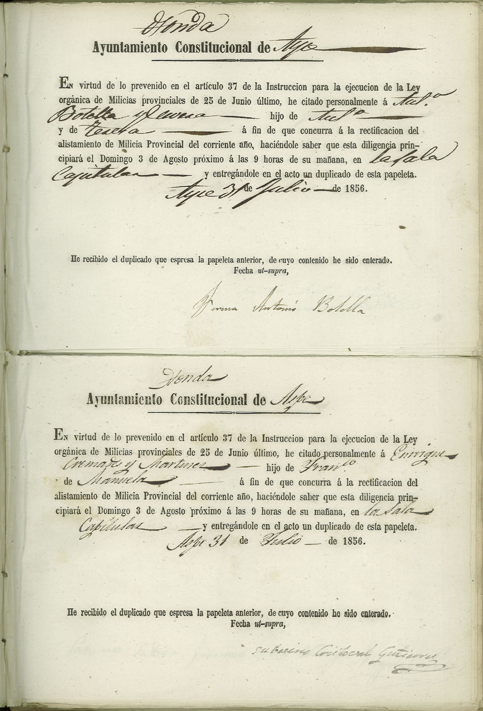 Actas de Alistamiento, 1856.