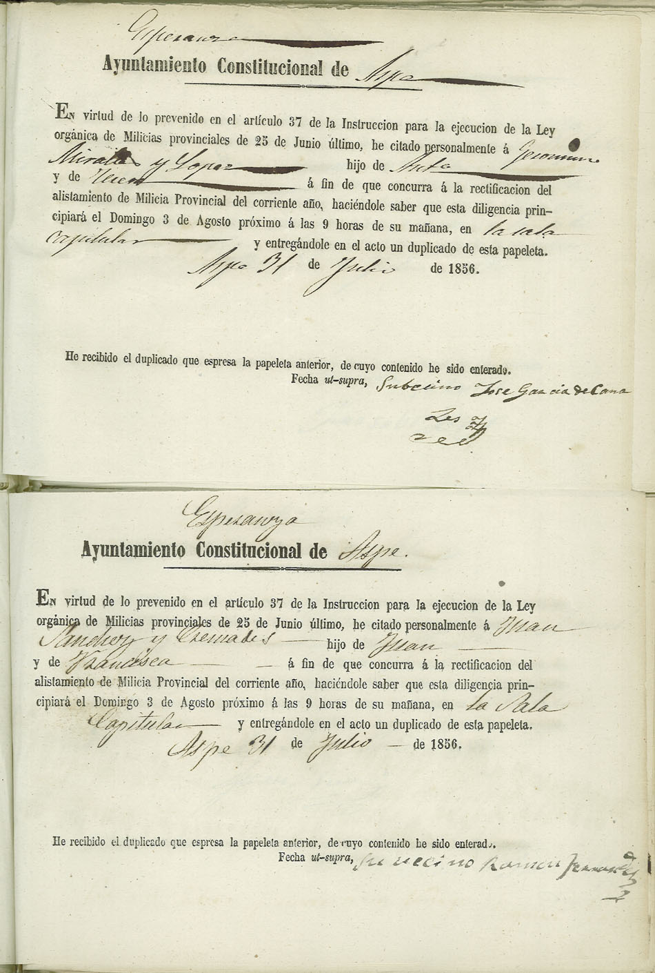 Actas de Alistamiento, 1856.