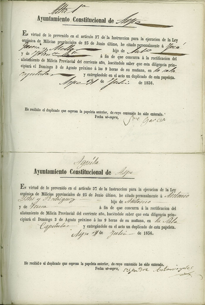 Actas de Alistamiento, 1856.