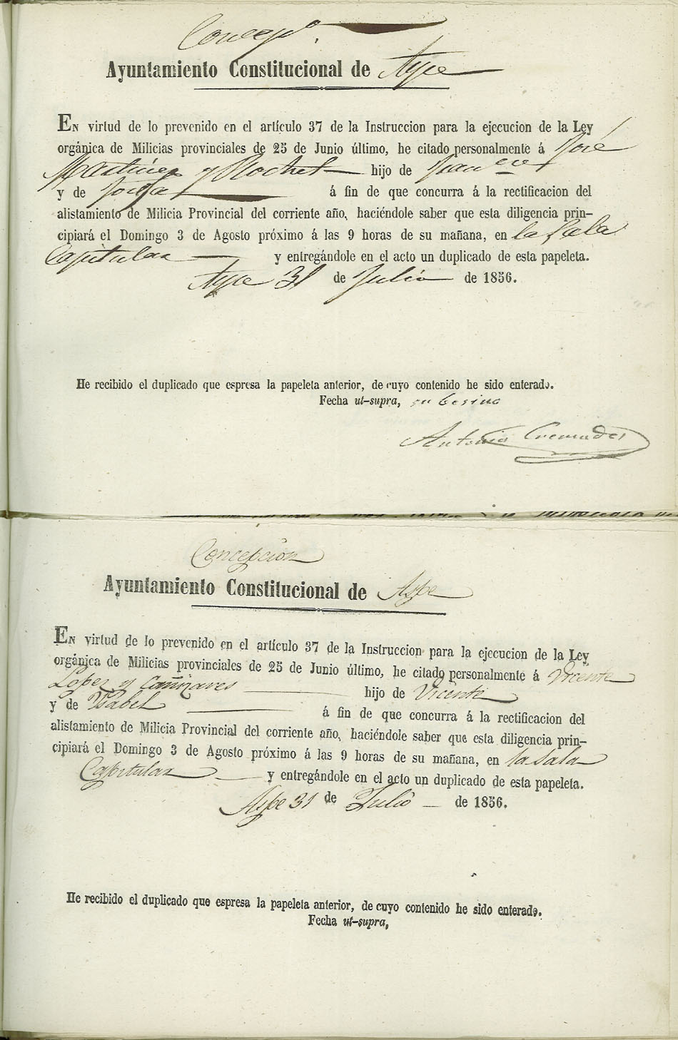 Actas de Alistamiento, 1856.