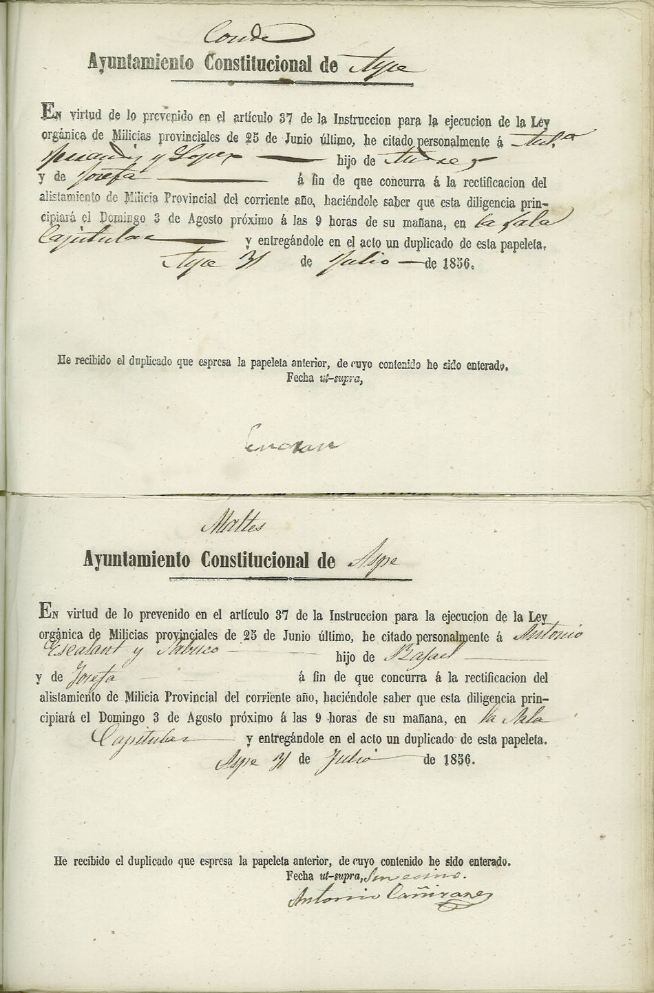 Actas de Alistamiento, 1856.