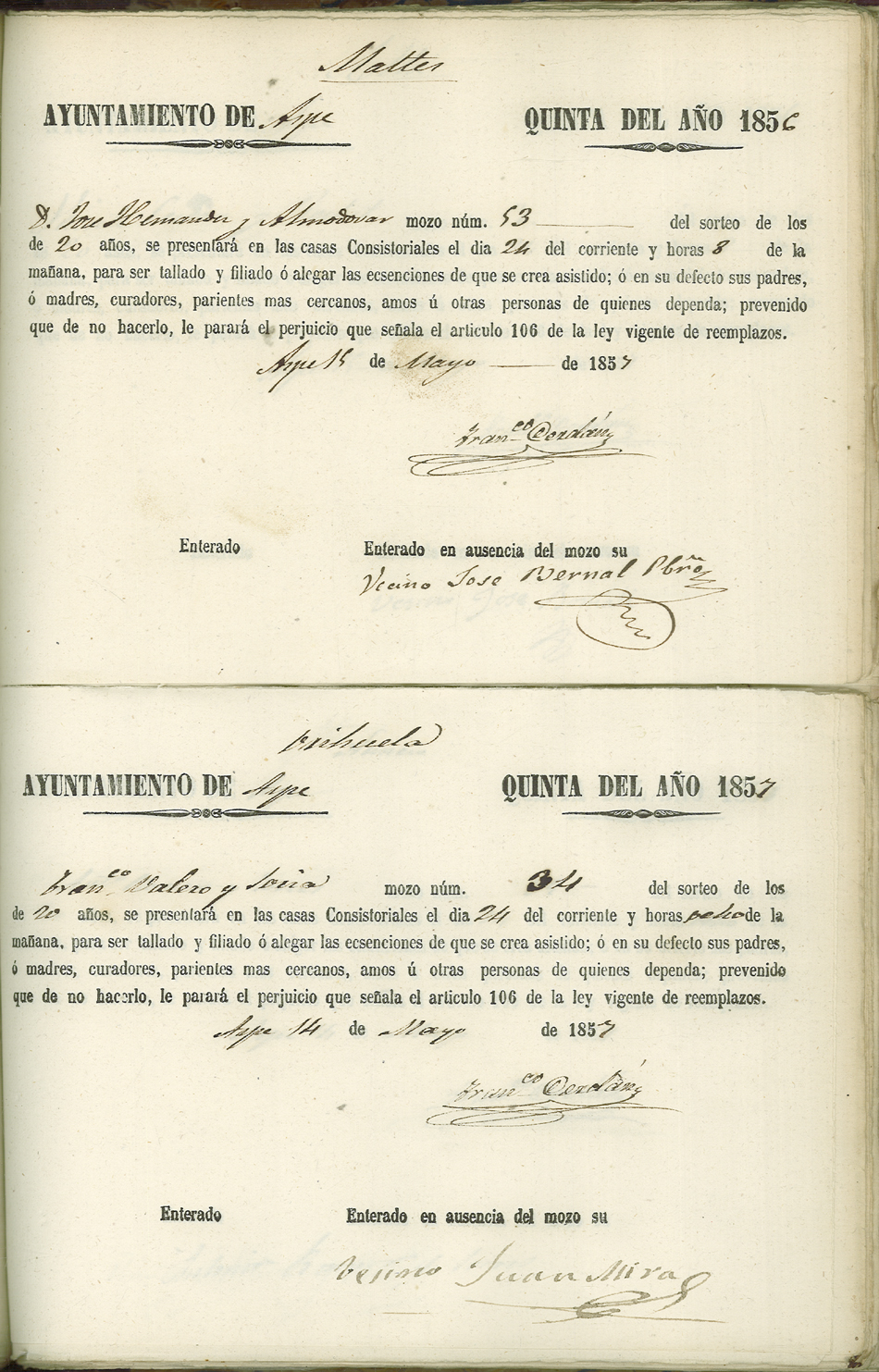 Actas de Alistamiento, 1857