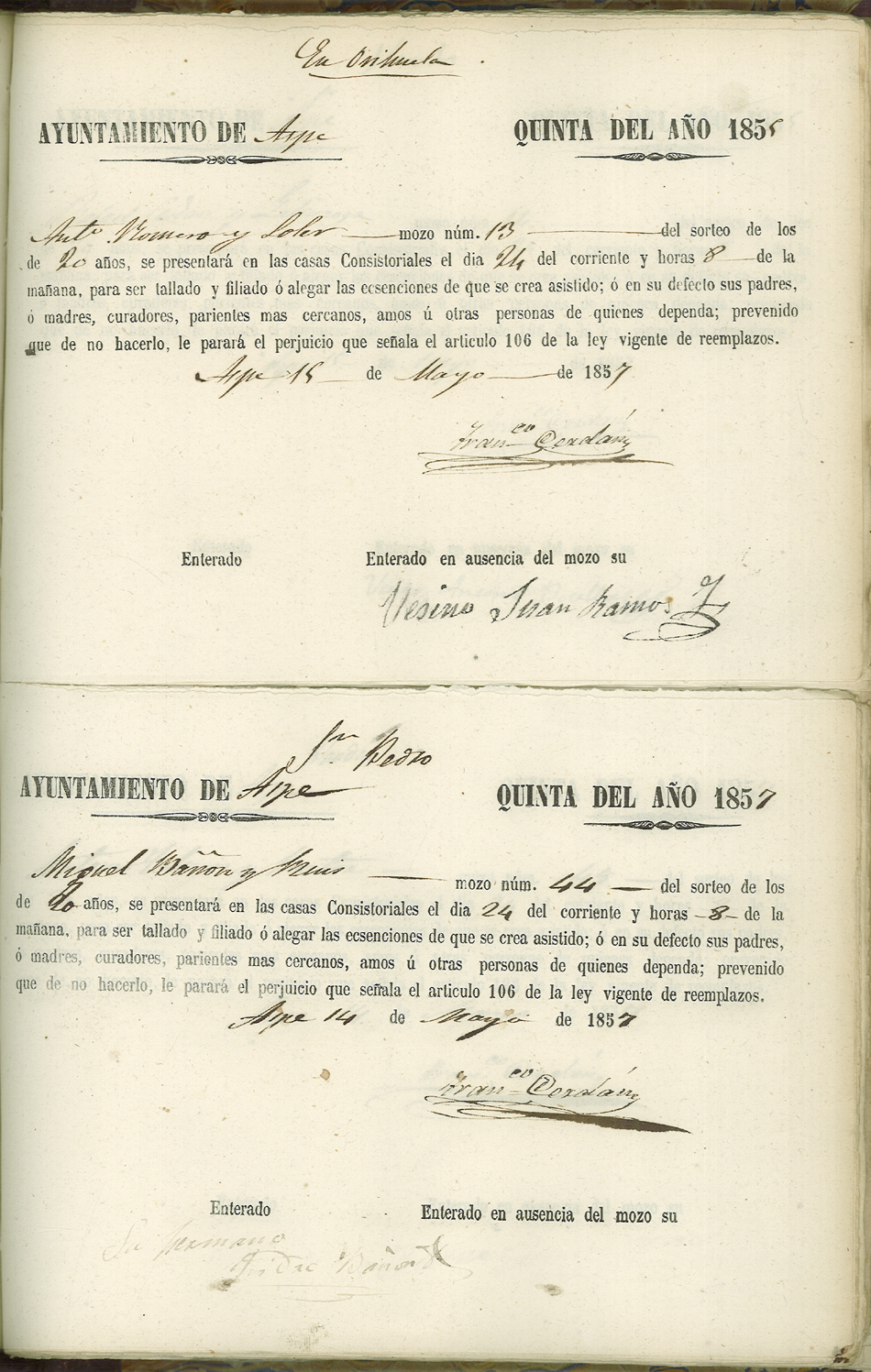 Actas de Alistamiento, 1857