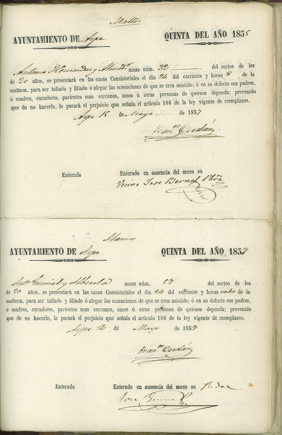Actas de Alistamiento, 1857