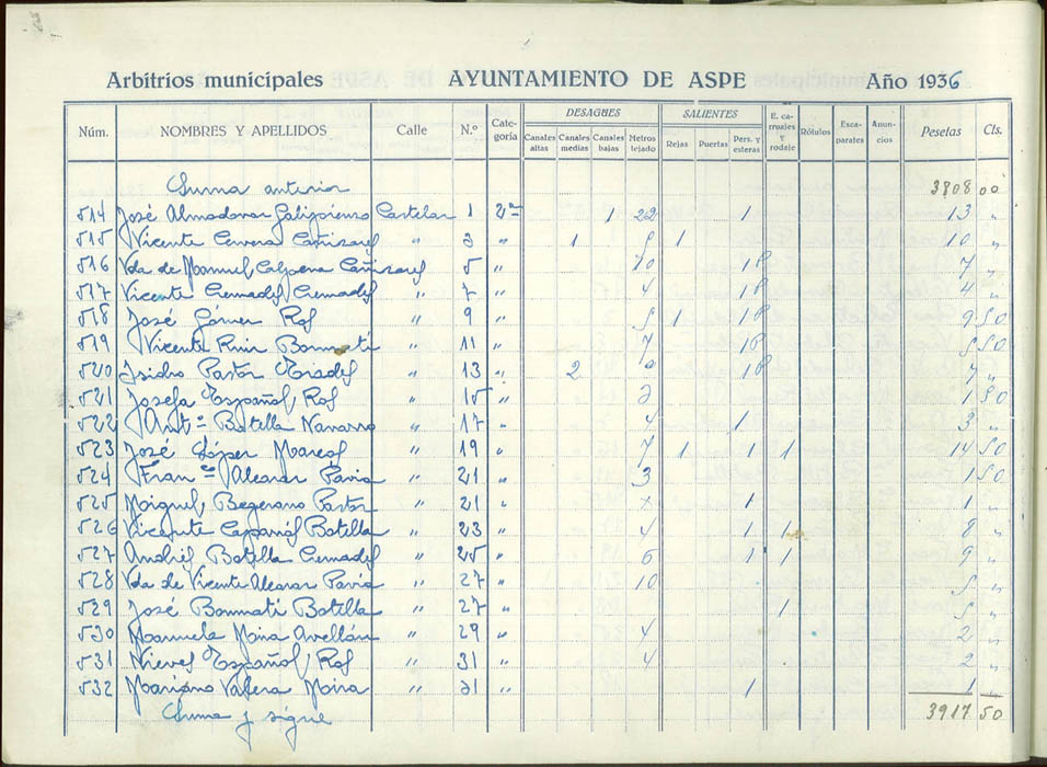 Padrón de personas sujetas al pago de arbitrios municipales, 1936