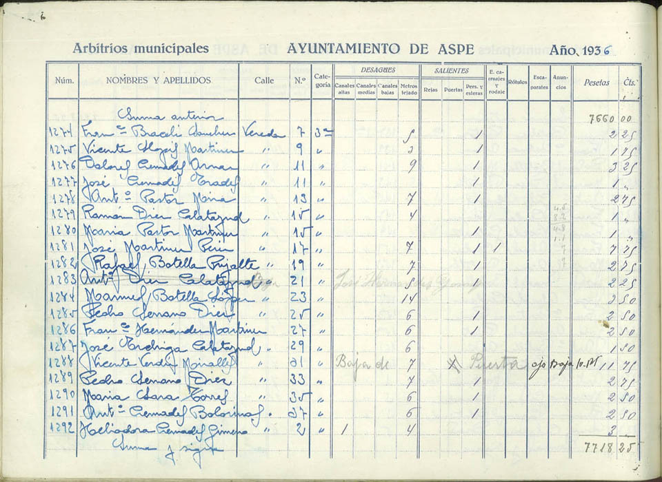 Padrón de personas sujetas al pago de arbitrios municipales, 1936