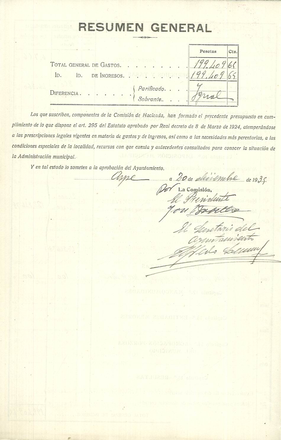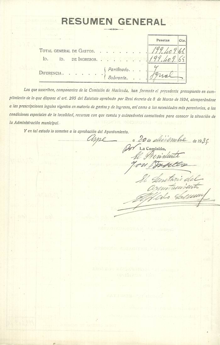 Presupuesto municipal ordinario del Ayuntamiento de Aspe para el año 1936