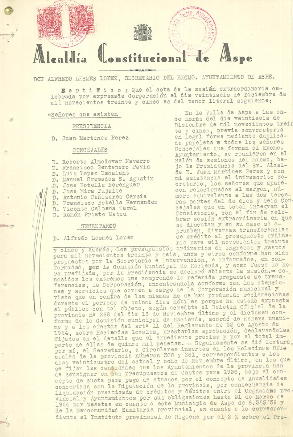 Presupuesto municipal ordinario del Ayuntamiento de Aspe para el año 1936