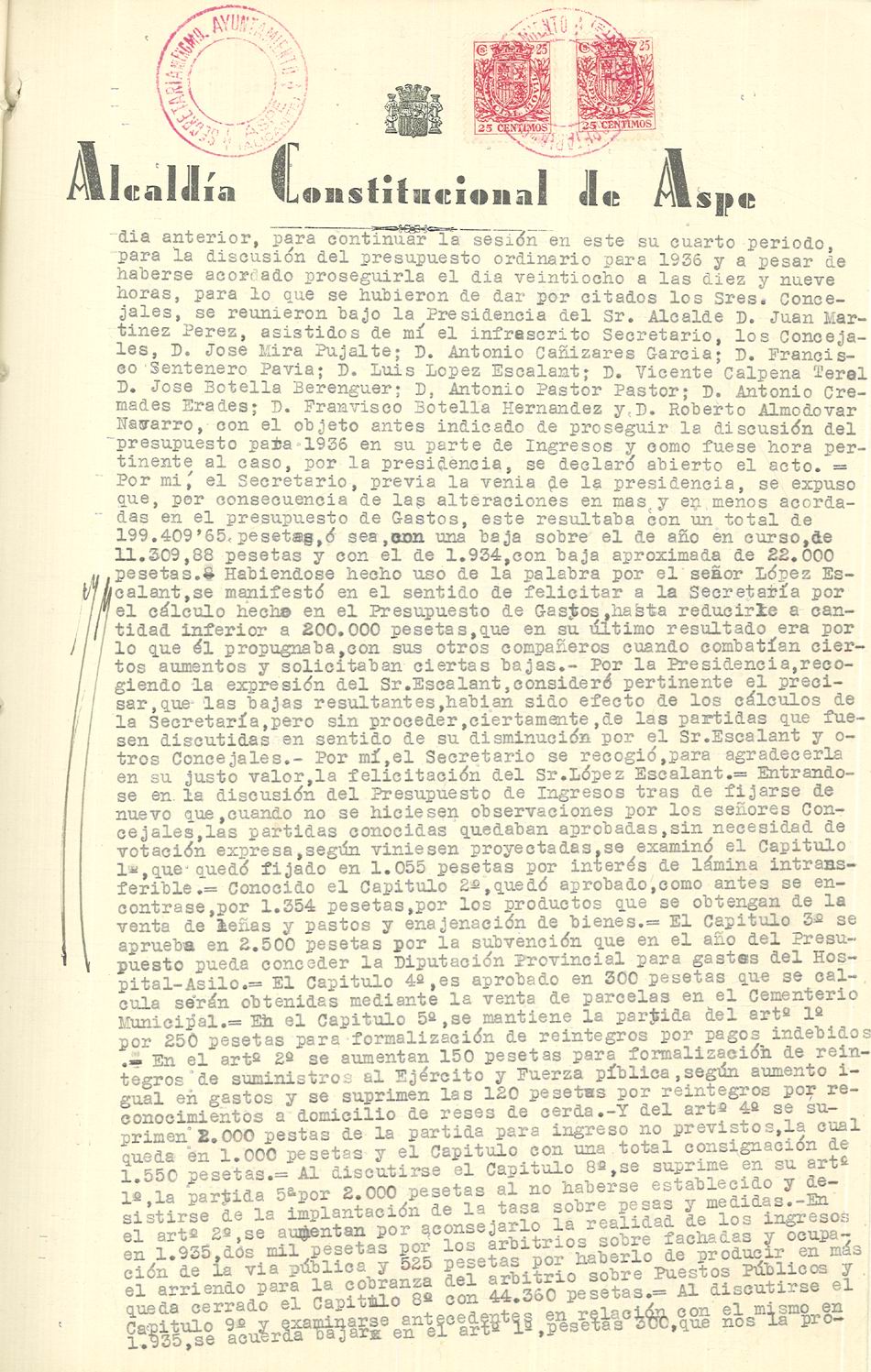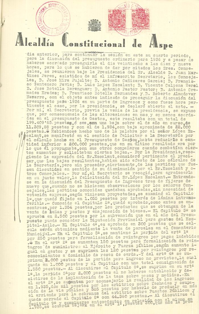 Presupuesto municipal ordinario del Ayuntamiento de Aspe para el año 1936
