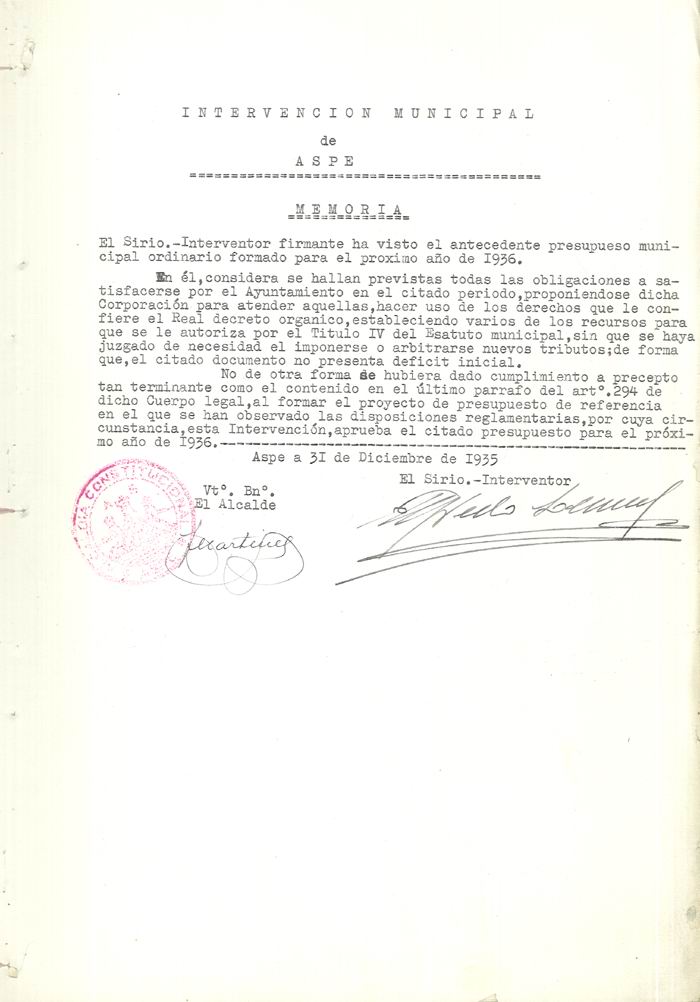 Presupuesto municipal ordinario del Ayuntamiento de Aspe para el año 1936