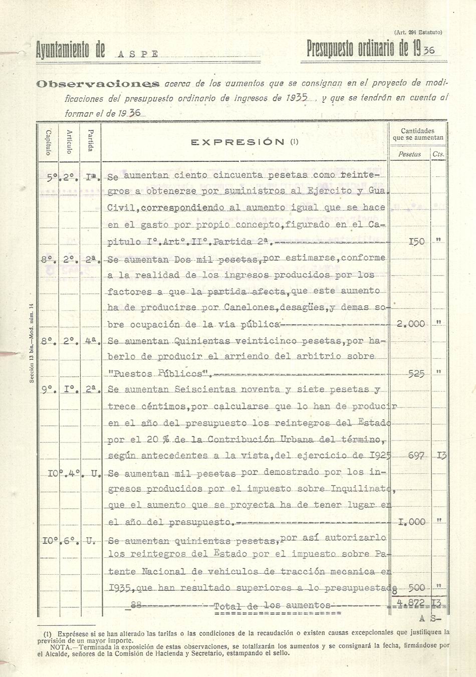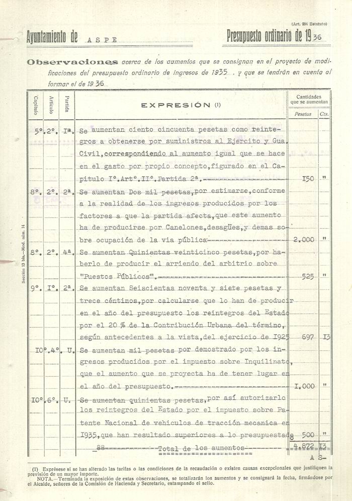 Presupuesto municipal ordinario del Ayuntamiento de Aspe para el año 1936
