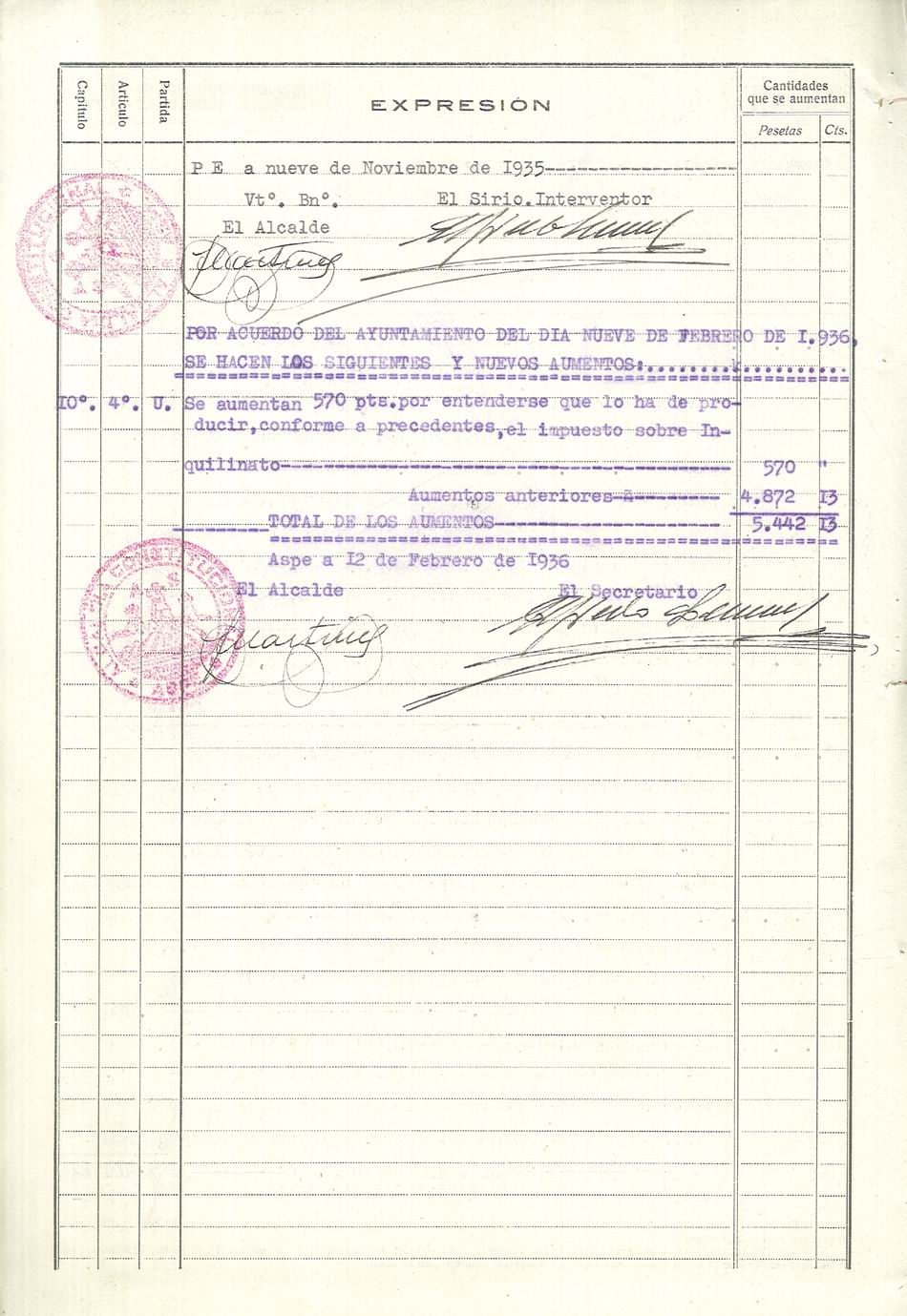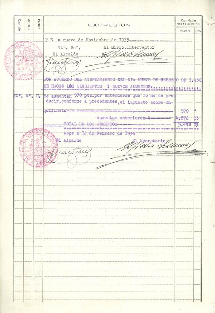 Presupuesto municipal ordinario del Ayuntamiento de Aspe para el año 1936