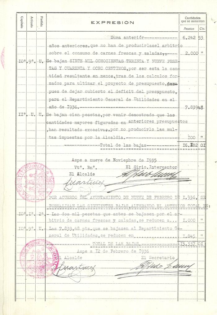 Presupuesto municipal ordinario del Ayuntamiento de Aspe para el año 1936