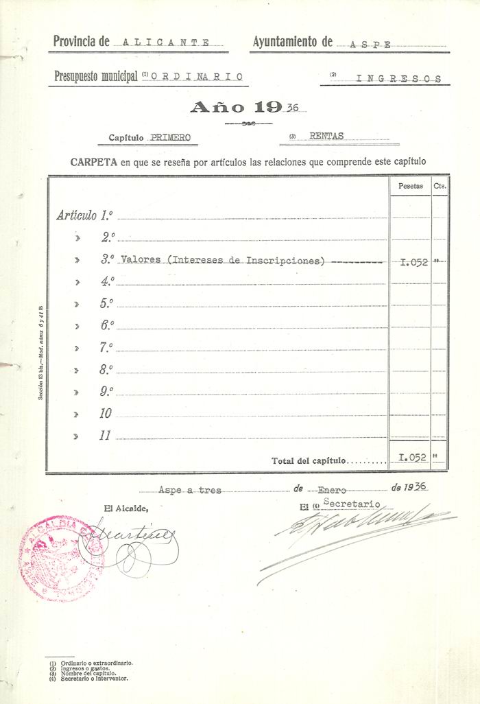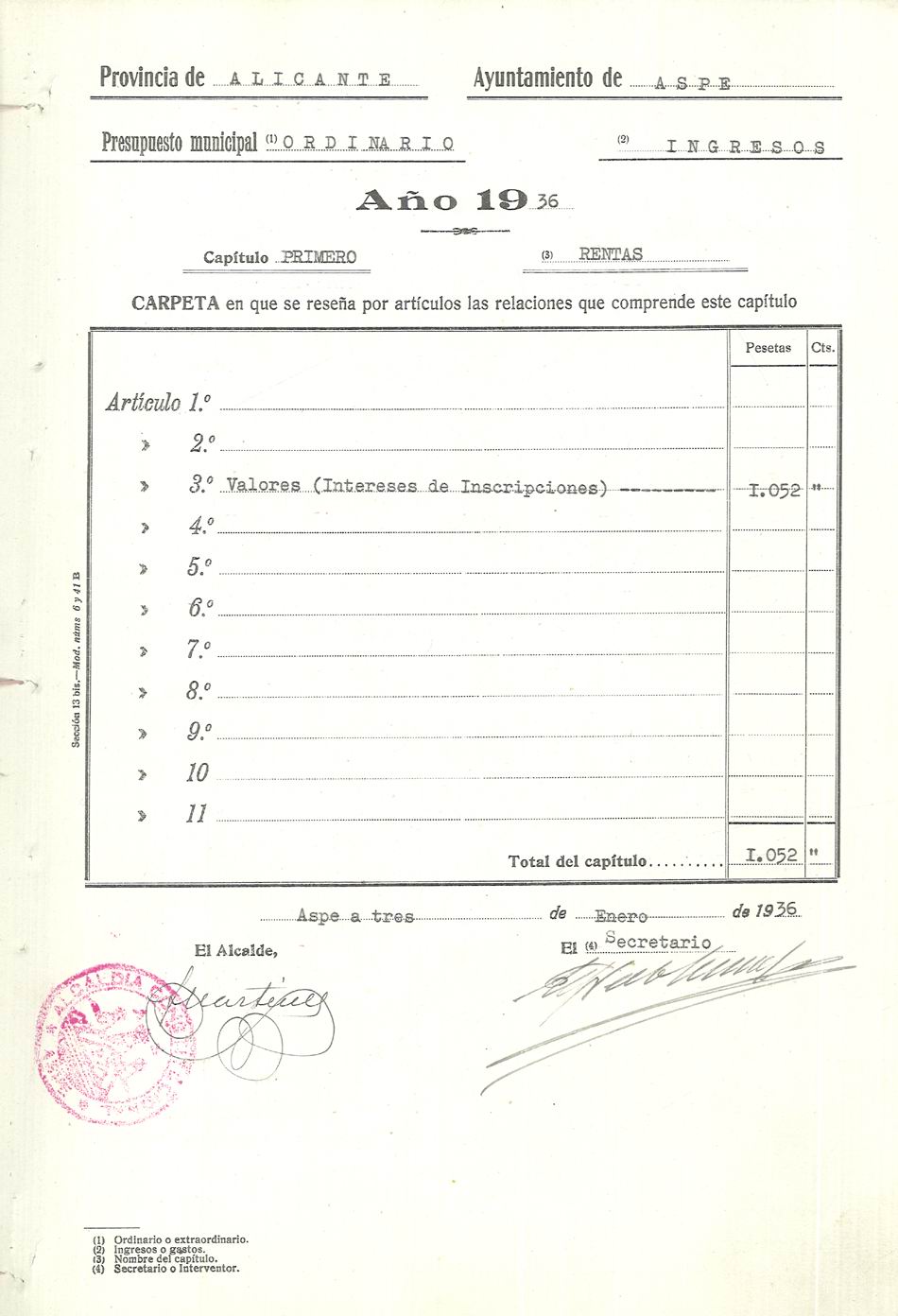Presupuesto municipal ordinario del Ayuntamiento de Aspe para el año 1936