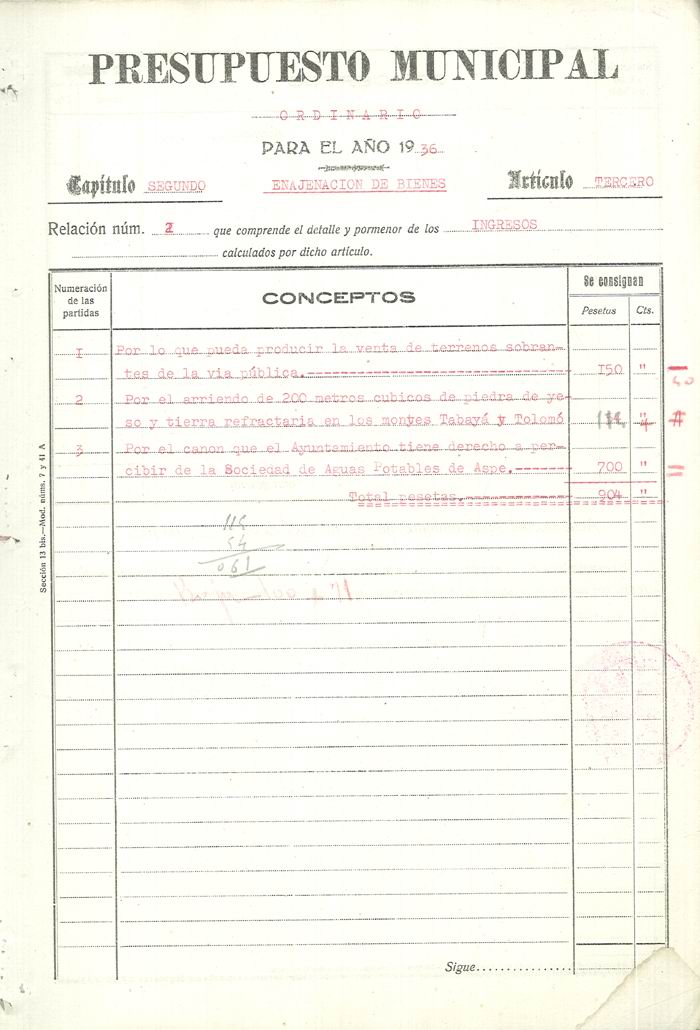 Presupuesto municipal ordinario del Ayuntamiento de Aspe para el año 1936