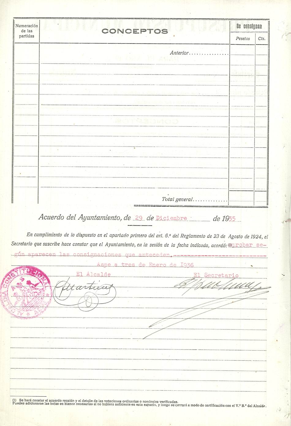 Presupuesto municipal ordinario del Ayuntamiento de Aspe para el año 1936