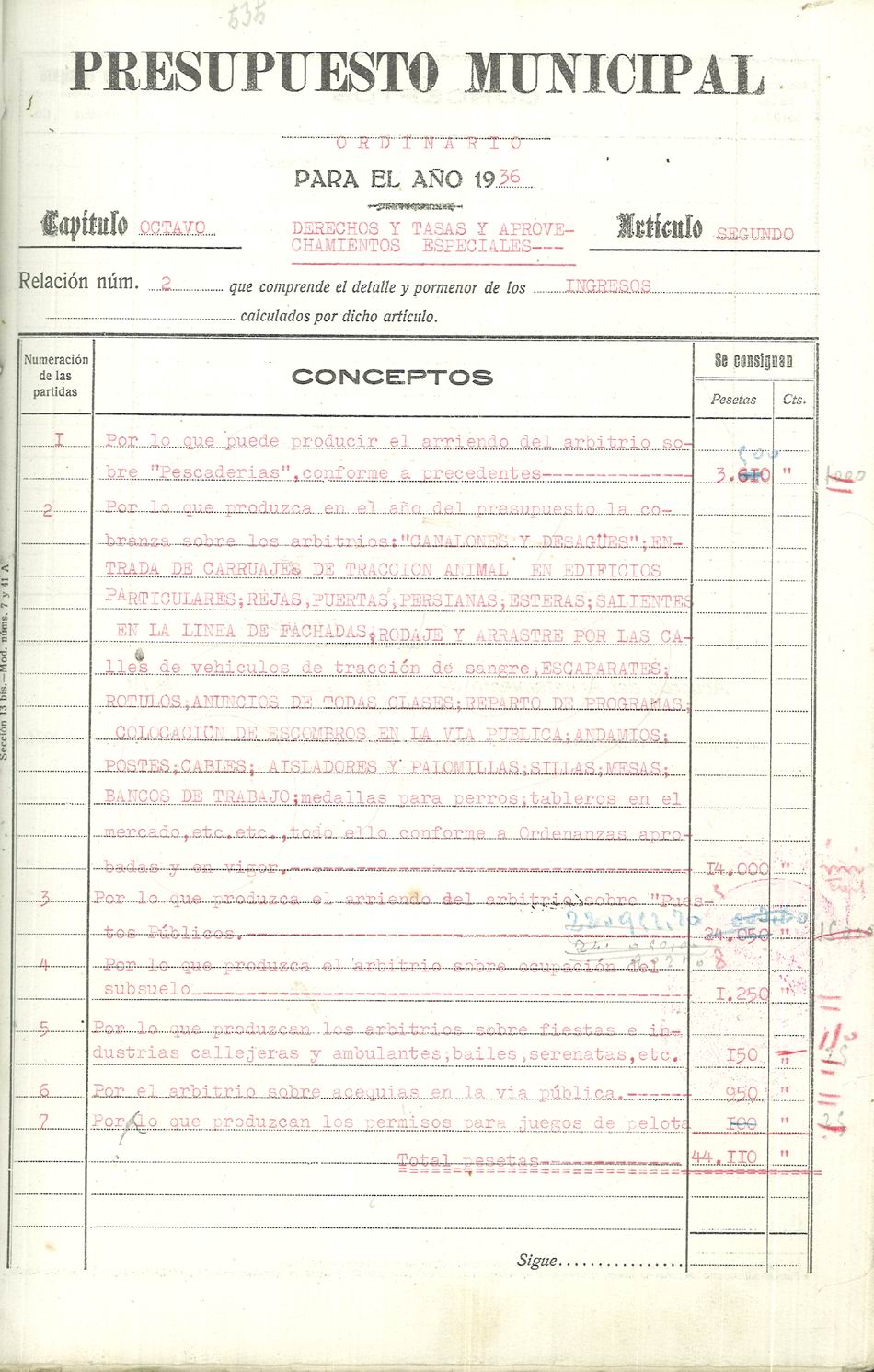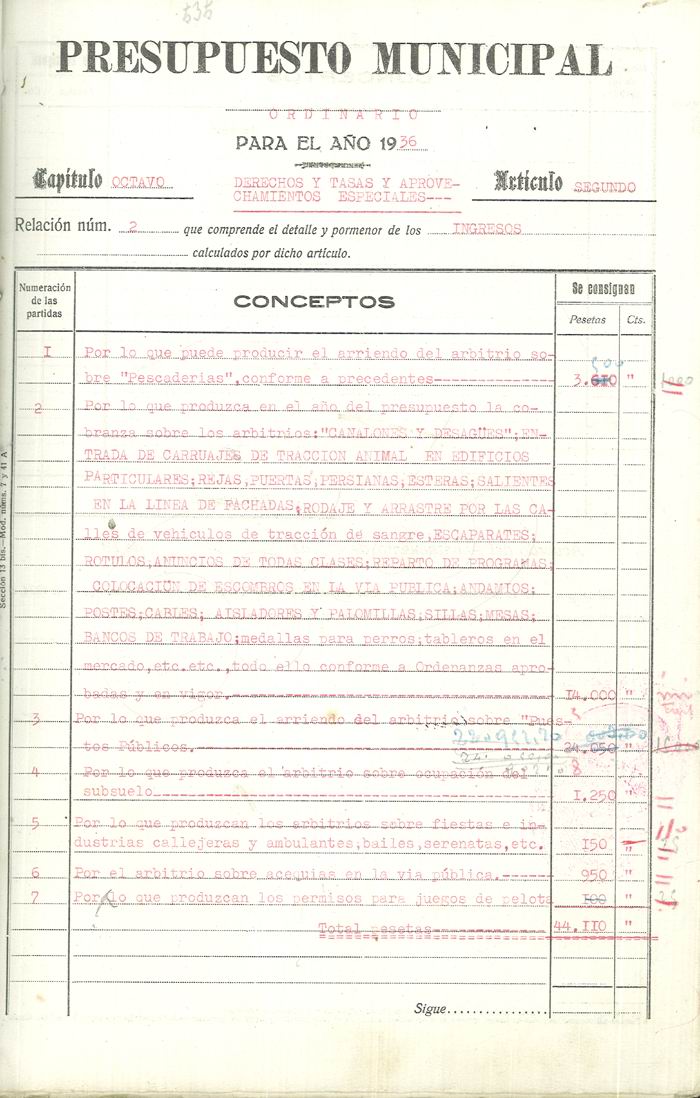 Presupuesto municipal ordinario del Ayuntamiento de Aspe para el año 1936