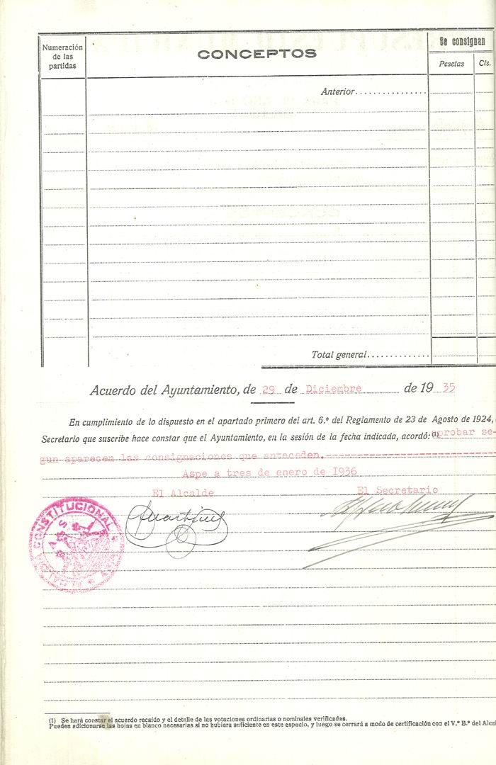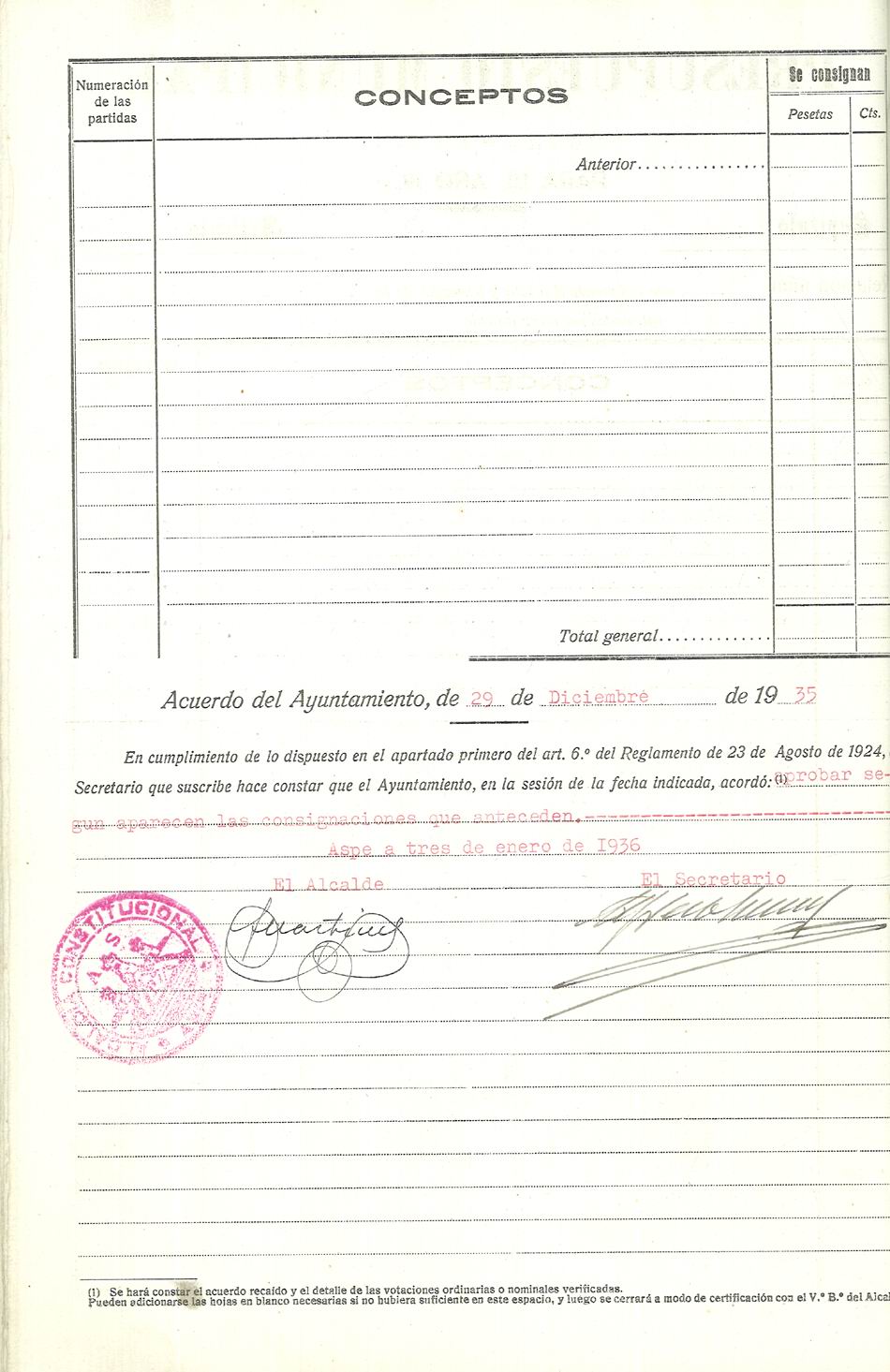 Presupuesto municipal ordinario del Ayuntamiento de Aspe para el año 1936