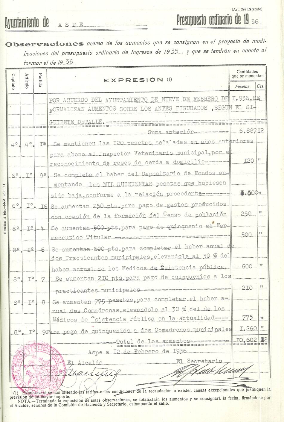 Presupuesto municipal ordinario del Ayuntamiento de Aspe para el año 1936