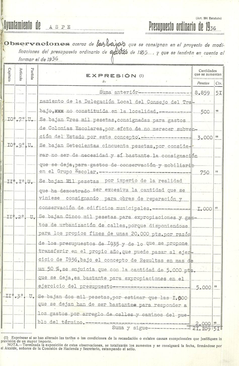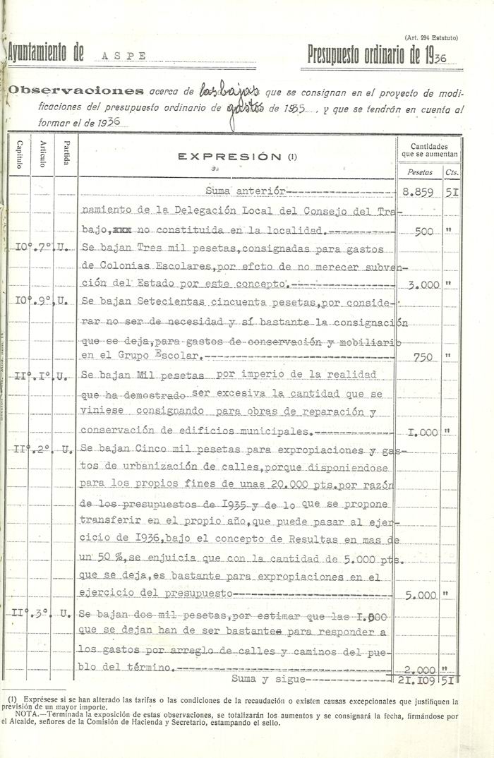 Presupuesto municipal ordinario del Ayuntamiento de Aspe para el año 1936