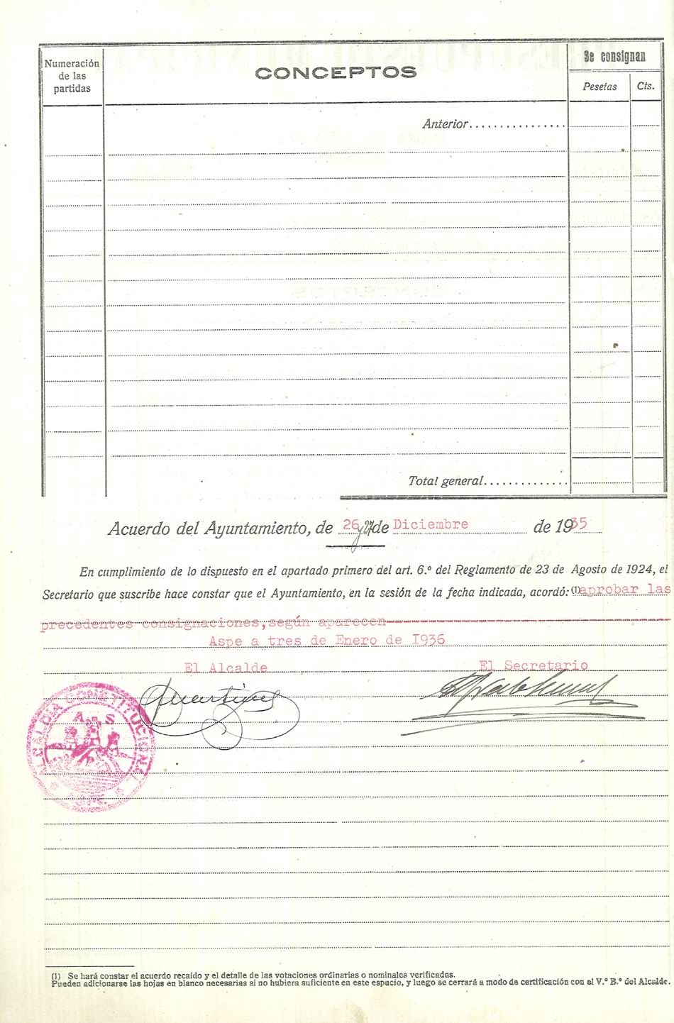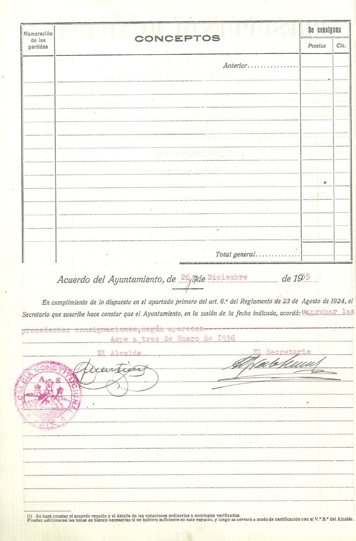 Presupuesto municipal ordinario del Ayuntamiento de Aspe para el año 1936