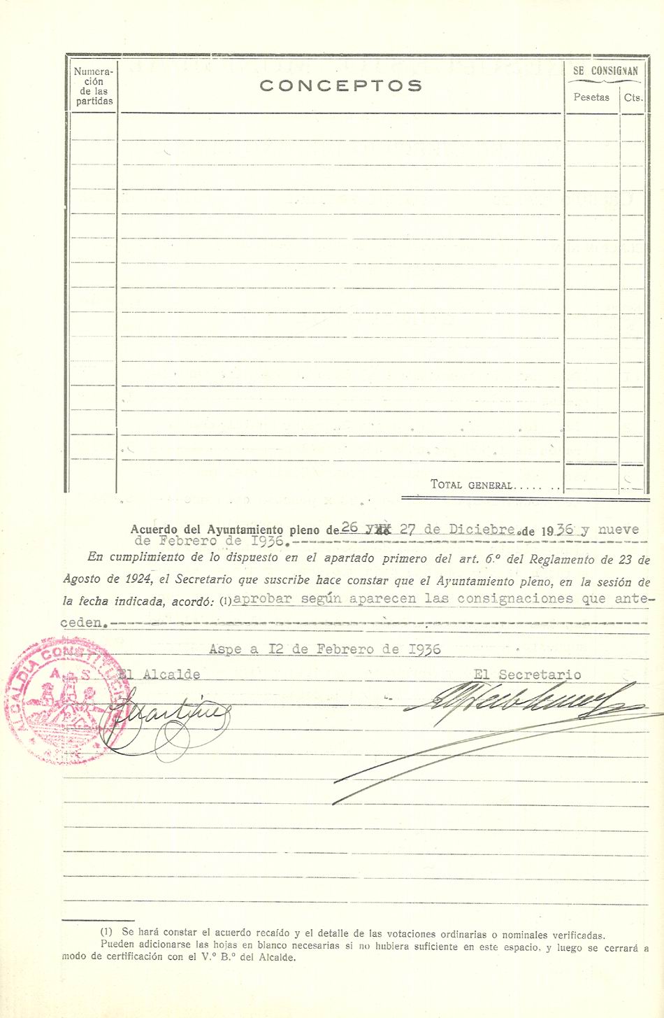 Presupuesto municipal ordinario del Ayuntamiento de Aspe para el año 1936