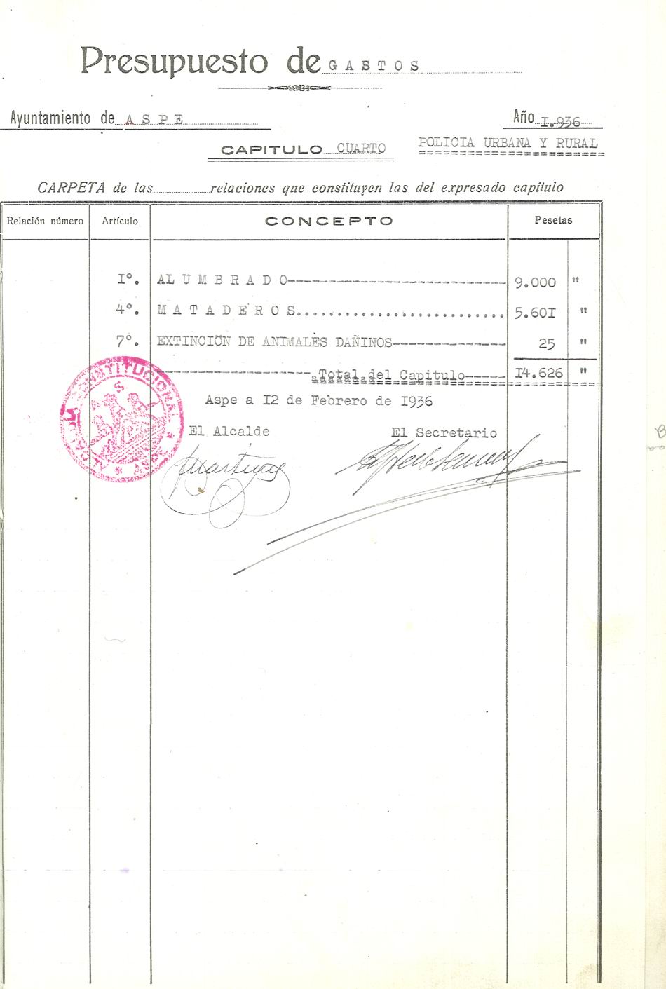 Presupuesto municipal ordinario del Ayuntamiento de Aspe para el año 1936