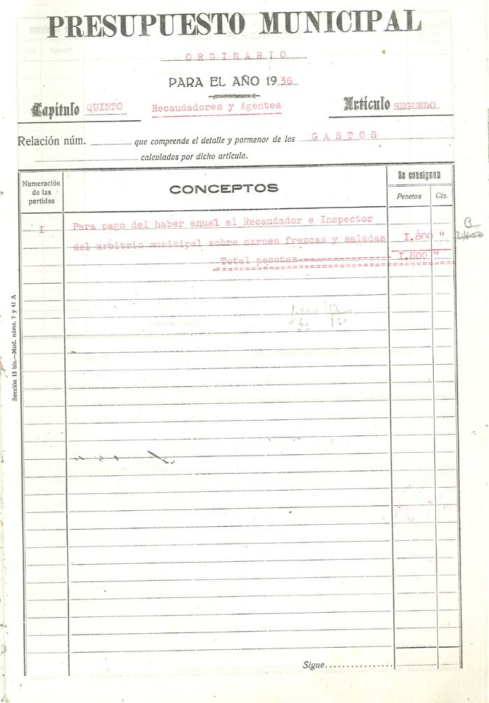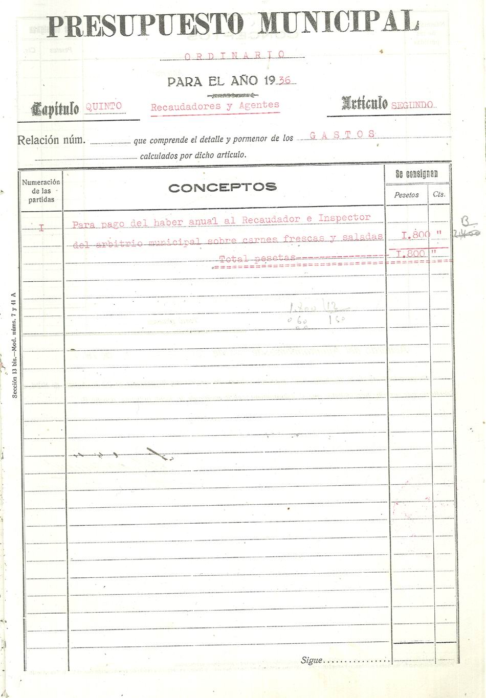 Presupuesto municipal ordinario del Ayuntamiento de Aspe para el año 1936