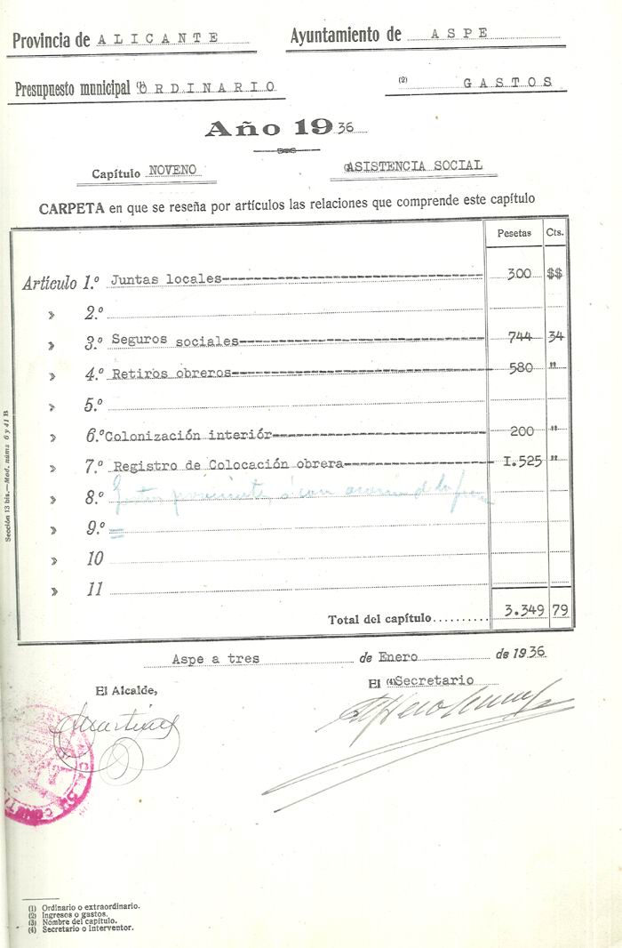 Presupuesto municipal ordinario del Ayuntamiento de Aspe para el año 1936