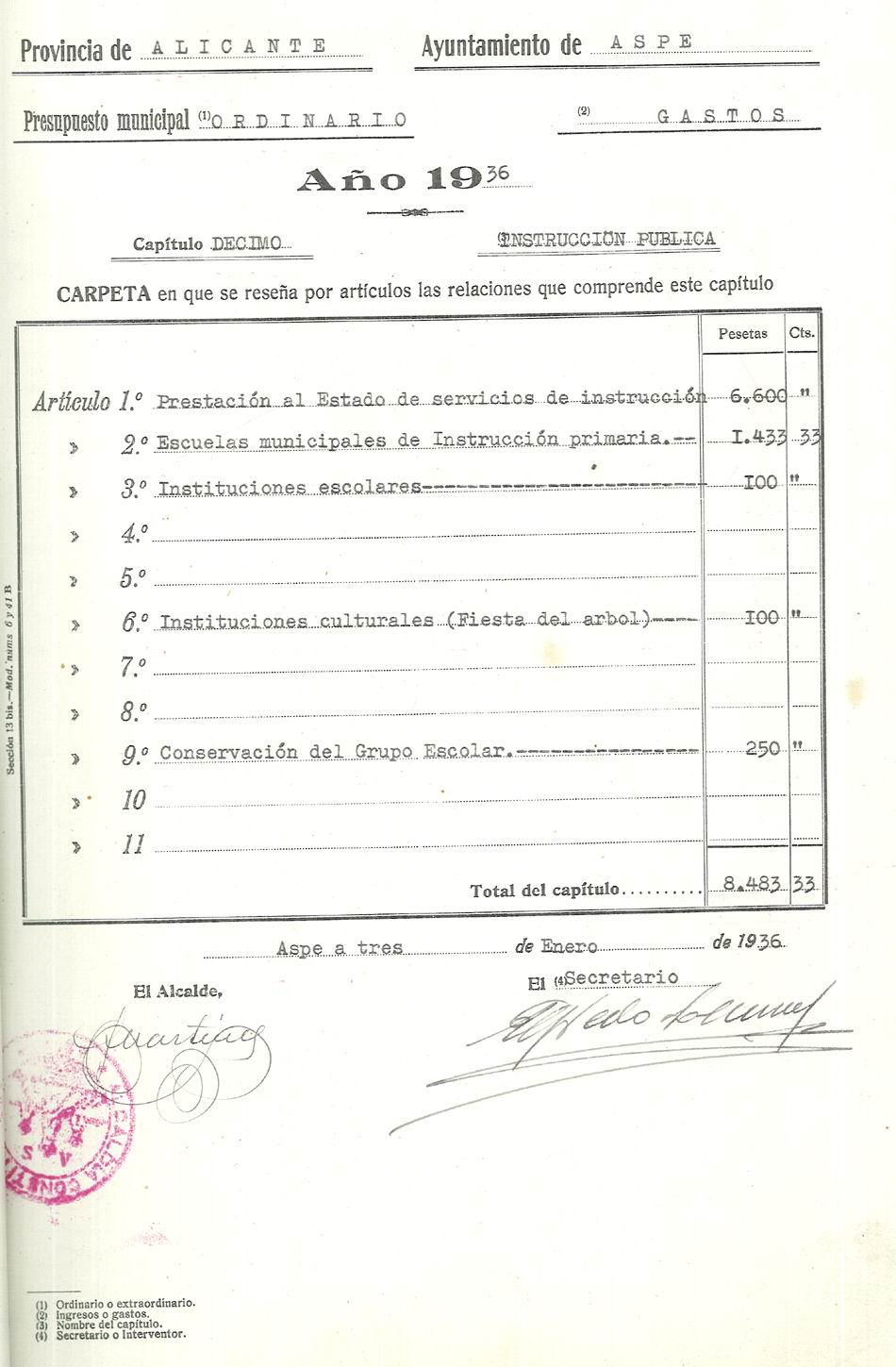 Presupuesto municipal ordinario del Ayuntamiento de Aspe para el año 1936