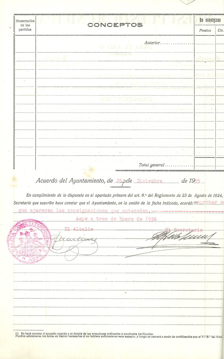 Presupuesto municipal ordinario del Ayuntamiento de Aspe para el año 1936