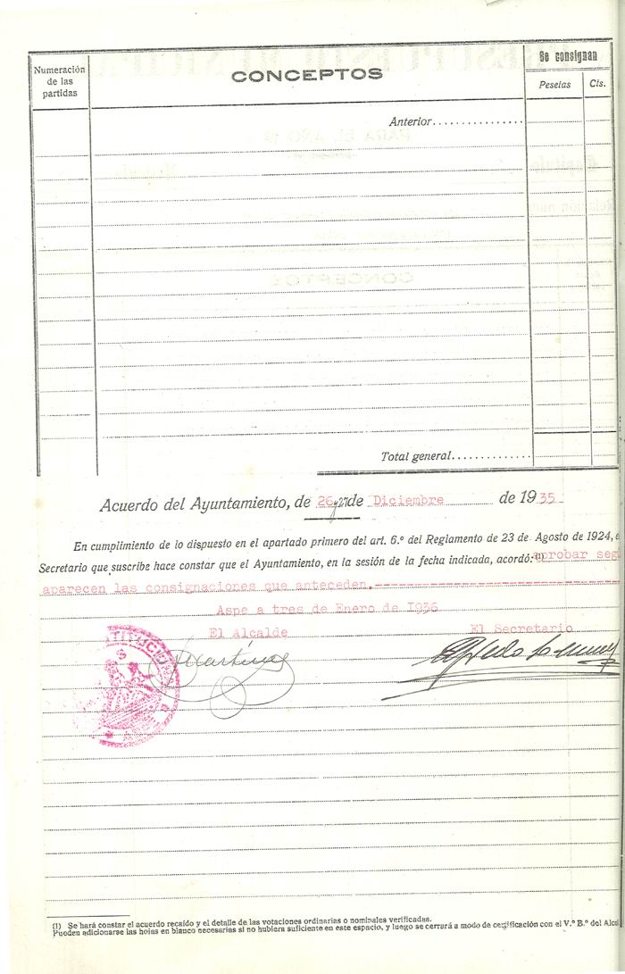 Presupuesto municipal ordinario del Ayuntamiento de Aspe para el año 1936