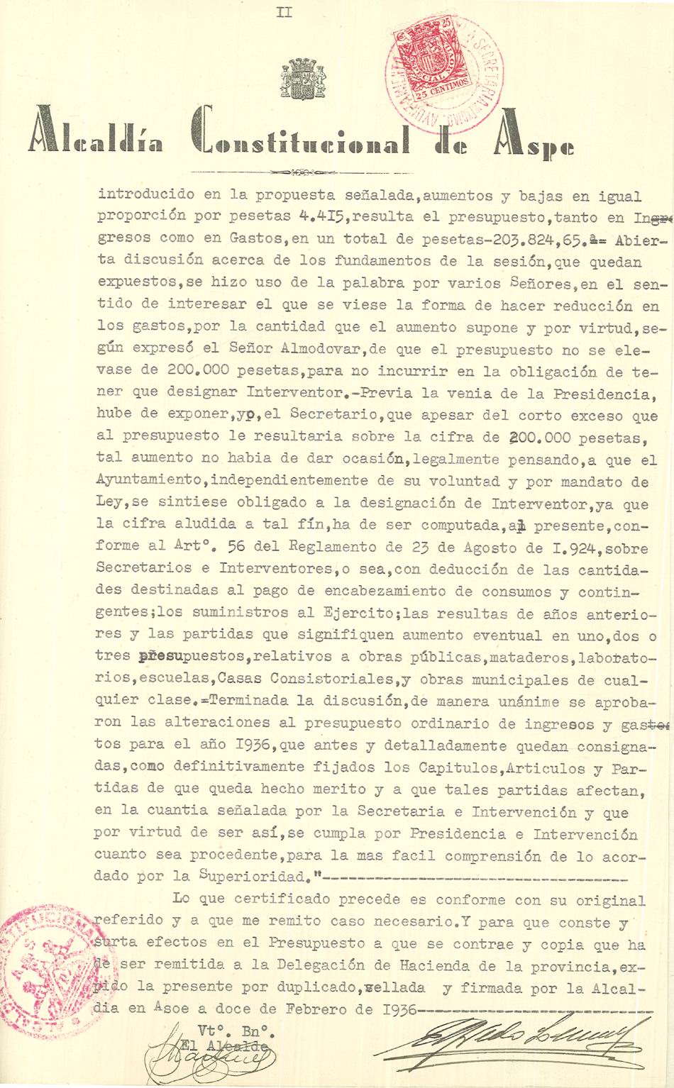 Presupuesto municipal ordinario del Ayuntamiento de Aspe para el año 1936