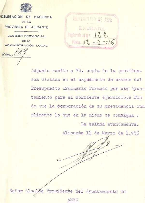 Presupuesto municipal ordinario del Ayuntamiento de Aspe para el año 1936