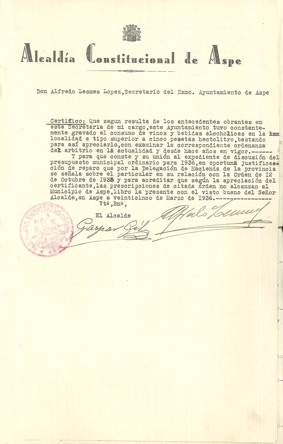 Presupuesto municipal ordinario del Ayuntamiento de Aspe para el año 1936