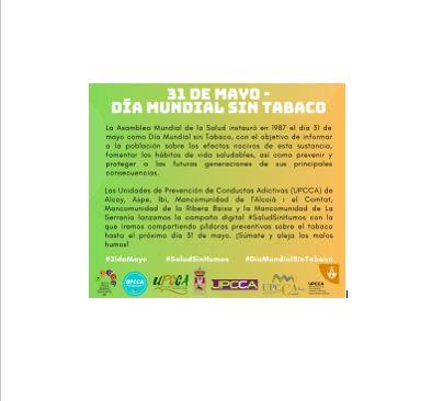 La Asamblea Mundial de la Salud instauró en 1987 el día 31 de mayo como Día Mundial sin Tabaco, con el objetivo de informar a la población sobre los efectos nocivos de esta asistencia, fomentar los hábitos de vida saludables, así como prevenir y proteger a las futuras generaciones de sus principales consecuencias. Continuando con…